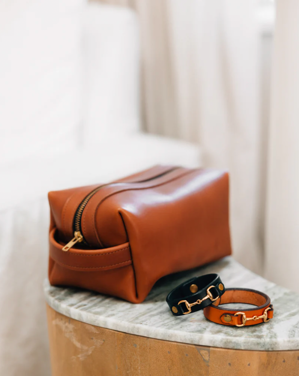 Handcrafted using timeless production methods, the Millstream Horse Bit Bracelet is entirely made using English bridle leather, brass rivets and a single brass plated mini horse bit. An ode to equestrian fashion, this elegant and fashion-forward accessory completes any outfit (on and off the horse).